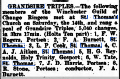 One month later, on 14 December, the first peal of Grandsire Triples since 1912 (when the bells were recast and rehung) was rung in 3 hours and 18 minutes by the Winchester Diocesan Guild of Change Ringers, in which diocese St Thomas’s still was at that time. They rang the peal again on 14 June 1919, and improved on their time … by one minute!